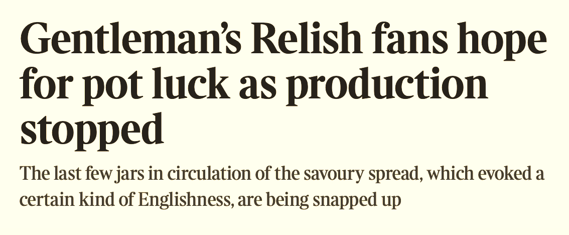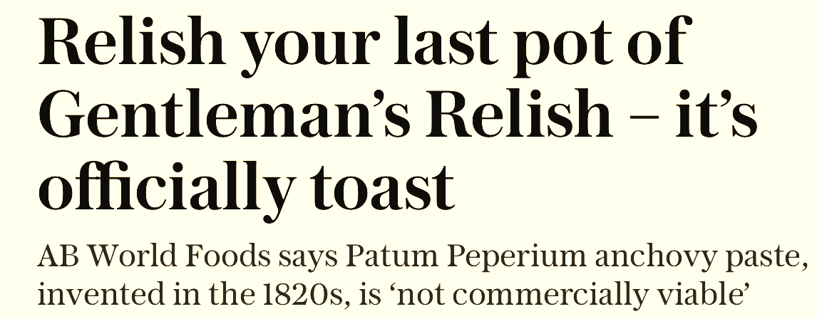 The Gentleman’s Relish is no more (that bizarrely antique ‘The’ being part of the charm) … it is rolling off the shelves and into oblivion. The Times even reports panic buying …