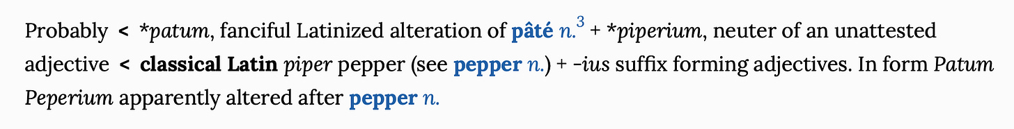 It is in the OED too, both under ‘Gentleman’s Relish’ and ‘Patum Peperium’. There’s something charming to imagine the donnish word-wranglers over there trying to make sense of the joke - the etymology section is a delight: